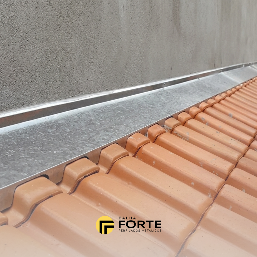 O rufo de capa (pingadeira) pode ser fabricado em medidas específicas? Sim. Para construtoras e obras corporativas, a Calhaforte fabrica rufos de capa com larguras e inclinações exatas, adaptando-se perfeitamente à espessura do muro ou platibanda do seu projeto arquitetônico.